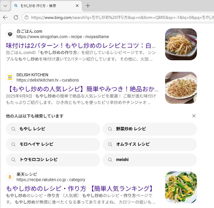 さらにホームページの内容も違います。エビフライのときは、エビフライの作り方の解説でしたが、もやし炒めはレシピのバリエーションが複数掲載されているページばかりでした。